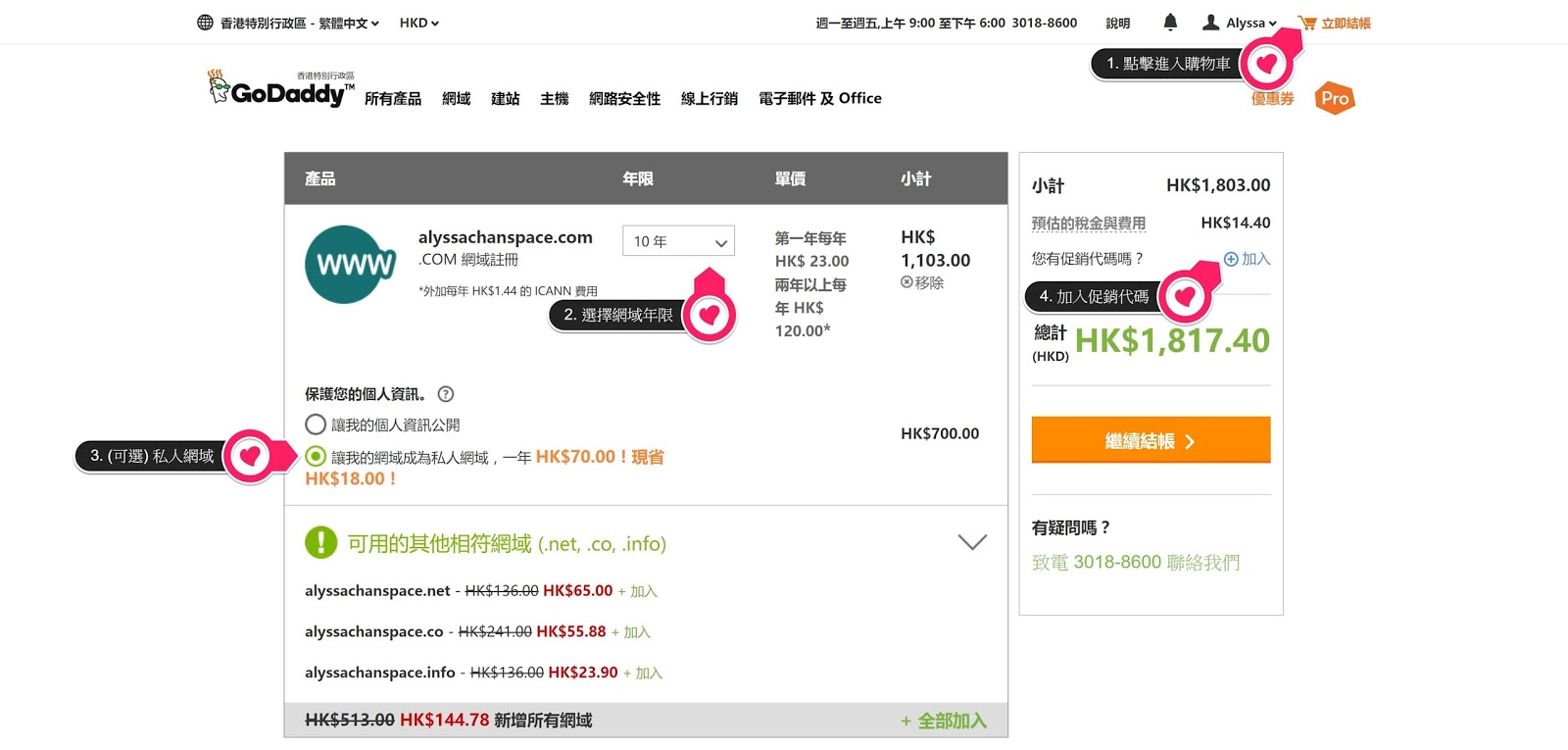 我有使用私人網域的功能,否則地址及電話等私人資訊都會被公開在 WHOIS 目錄中。而這筆費用要HK$70/年,而使用促銷代碼最平只需US$1/年(HK$7.5/年),省很多呢!