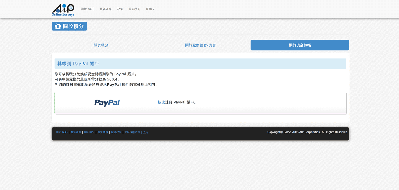 註冊:https://hk.m.aipsurveys.com/(如過透過筆者推薦加入,可得50分額外積分。須透過推薦電郵中的連結註冊才有喔。筆者還有5個名額,有興趣請透過電郵 alyssa@alyssachan.space 聯絡我,我會發推薦電郵給您。)